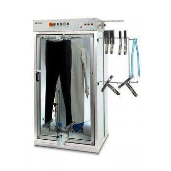 В стандартный комплект поставки паровой камеры входит одно устройство для финишной обработки одного брючного изделия и один манекен для обработки пиджаков, курток, пальто, платьев и т. п., но при этом система фитингов позволяет легко установить и использовать в одной камере два устройства для брюк или два манекена. Рабочий цикл полностью автоматизирован и регулируется тремя таймерами.